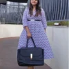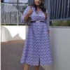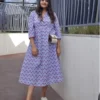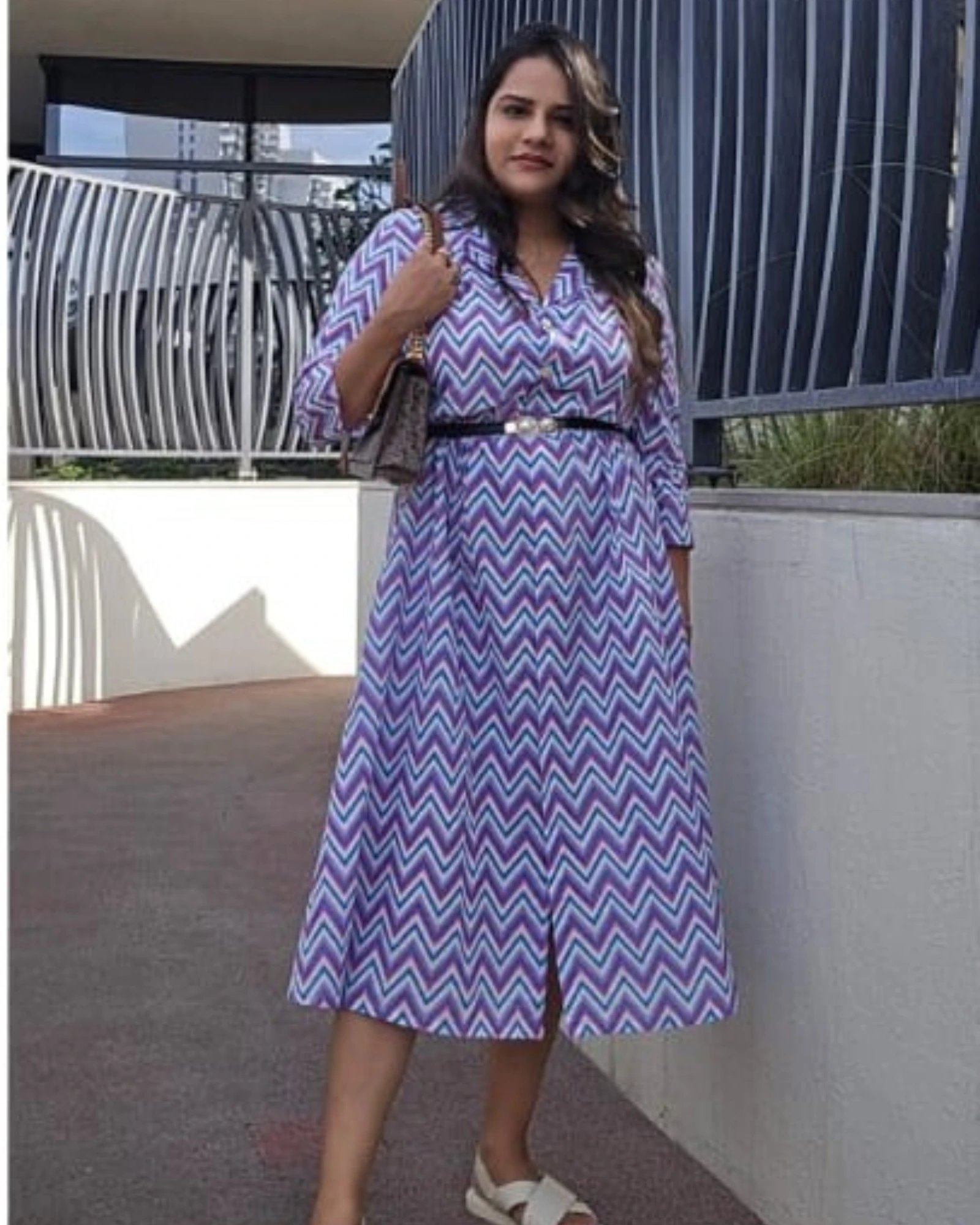Step into vibrant confidence with this purple chevron shirt-dress. The dress flows in a structured A-line midi silhouette and features a button-down front, collar neckline, and 3/4th sleeves. Style it with a belt for a cinched waist or go breezy with flats — versatility at its best!